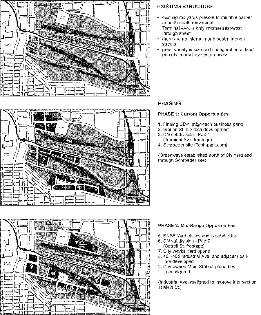 To achieve this vision for the Flats, staff have developed a series of phases through which the plan may evolve. These phases are not timed in discrete years, rather they are event-based, flexible and responsive. Events that will spur implementation of the plan may include: redevelopment of the Finning lands, the Schroeder property, and CN's subdivided parcels on Terminal Avenue; development of the City-owned blocks at Main and Terminal; construction of the VCC Skytrain Station; the removal of BNSF's southern yard; and the possibility of further rationalization of CN's trackage.