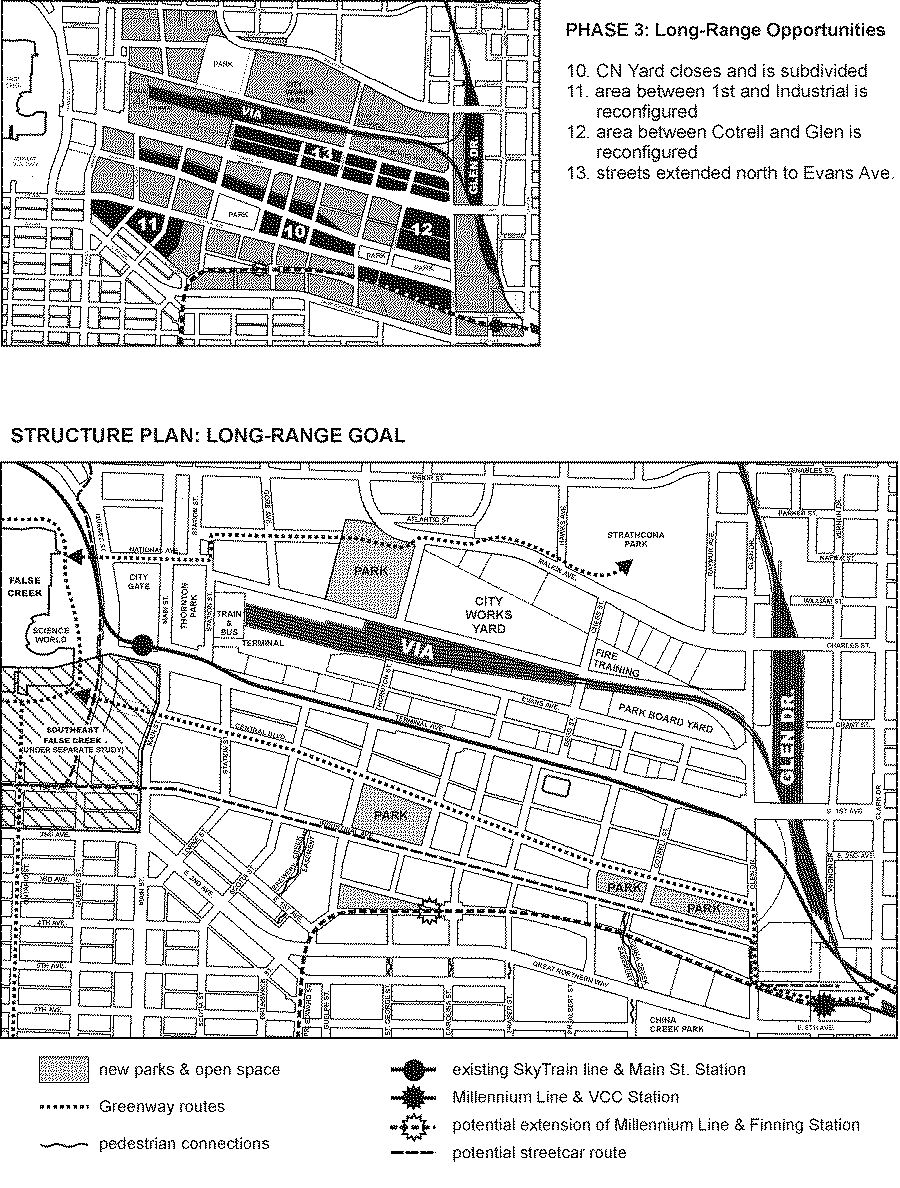 This is a large-scale urban design plan which shows how the streets, open spaces and other urban elements may be formed in the future. Its purpose is to guide subdivision and redevelopment patterns in the False Creek Flats. At the scale of this plan, building massing and detailed street design are not addressed. The current regulations governing land use and development are assumed and no changes to them are proposed here. It is an incremental plan with a phasing strategy that accommodates existing land uses while responding to many opportunities for change that will occur gradually over a very long period of time, beginning today but extending to 50 years or so in the future. It is a comprehensive plan in that it allows for many uncertainties and contingencies while striving to achieve an overall structure for the area.