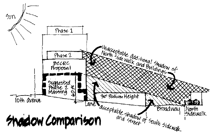 Shadow analysis shows that Phase 1 would allow sun access to north Broadway sidewalks during the summer. However, there are two aspects of the design which result in undesirable shadows on the north side of Broadway from September to March. A more concentrated shadow pattern would result from a consolidation of all taller elements for the block in the single Phase 1 tower. However, the impact, illustrated by the dark hatched area in Fig. 5 below, demonstrates the shadow of the proposed Phase 2 mid-rise massing at 36 m (118 ft.) in height. That structure would completely block sunlight access to the remainding easterly two-thirds of the 152 m (500 ft.) long block on the north side of Broadway between September and March. The heavy dashed line in Fig. 5 below indicates a 18.3 m (60 ft.) height and 3.0 m (10 ft.) lane setback for the Phase 2 portion of the site, which preserves sun access on Broadway from September to March.