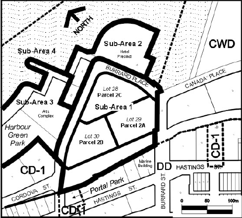 Burrard Landing, which was rezoned in 1996, is a 17-ha (42-acre) site containing four sub-areas, a street and shoreline walkway system, an Arts Complex site and facility, a waterfront park and two major public open spaces. ( See Figures on the following pages. )