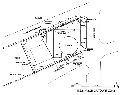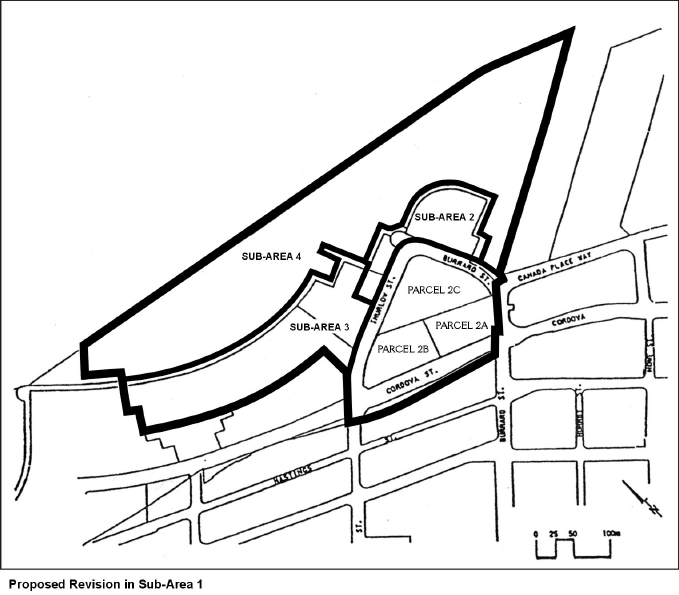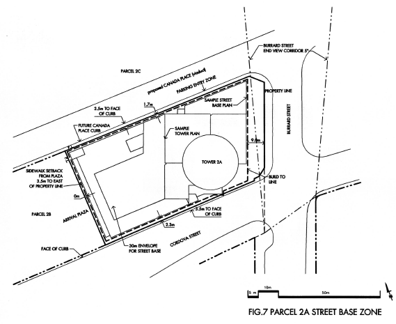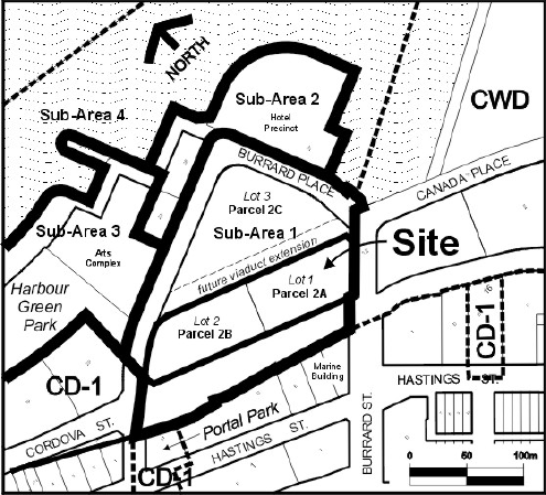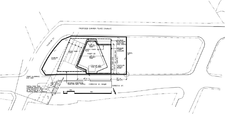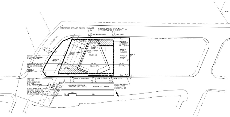 - pursuant to subdivision, development parcels 2A and 2B would be made narrower in anticipation of a future Canada Place viaduct extension westward from Burrard Street to Thurlow Street across the southern portion of Parcel 2C;