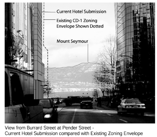 It is long-standing policy that staff do not recommend intrusions into the major view corridors (except for the Queen Elizabeth Park perspective). Moreover, staff cannot discern a public purpose to be served by encroaching on the view corridors as compliance is technically possible. Accordingly, staff recommend that the Hotel tower be brought into full compliance with the view cone. The relaxation options are presented for Council consideration without staff support.