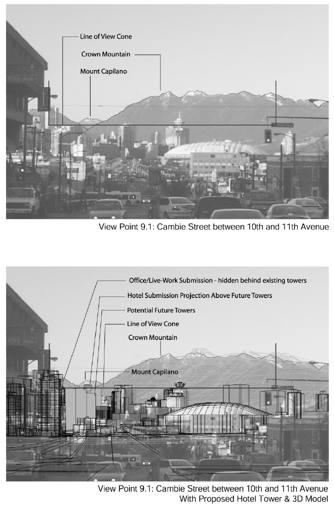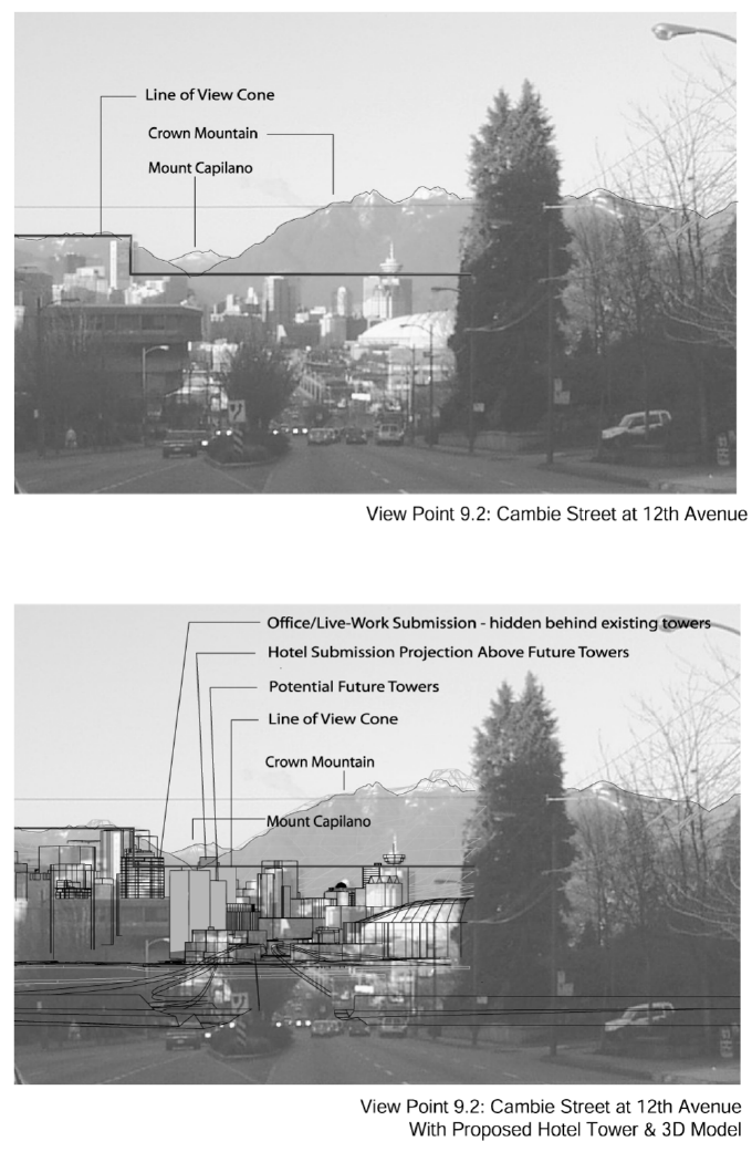 The Hotel tower, which is proposed to be 143.9 m (472 feet) to the top of the rooftop mechanical elements to which view intrusion is measured, will encroach above the maximum height specified for buildings in the Cambie/12th and Cambie/10th view cones in the amount of 13.4 m (44 feet) and 10.1 m (33 feet) respectively. (See photo illustrations on pages 13 and 14 of Appendix E) [Note: The maximum building height calculated for view protection includes all appurtenances such as mechanical/elevator penthouses, decorative roofs and aerials. Building height for by-law purposes is otherwise calculated to the roof parapet of the uppermost occupied space, which in this case is 136.4 m (447.5 feet).] The intruding portion of the tower would be situated in the westerly portion of the view in front of Mount Capilano, which is framed by a visually compelling lower valley in the North Shore mountain backdrop. The intrusion would not obscure the mountain peak or intrude into the main easterly Crown/ Grouse Mountain part of the view corridor. Staff are also concerned that approval of its height may set a precedent for other potential development sites in the view cones.