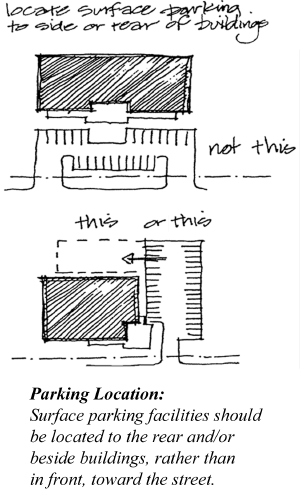 (b) Surface parking facilities should be located to the rear or beside buildings.