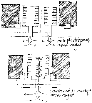 Shared driveways and parking facilities can reduce impervious surfaces and simplify turning movements from busy streets.