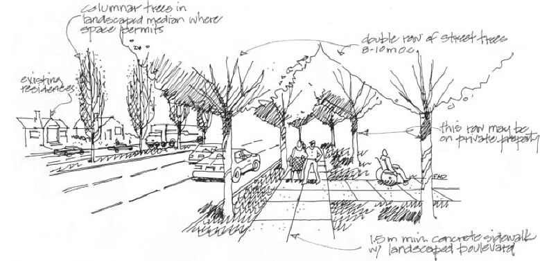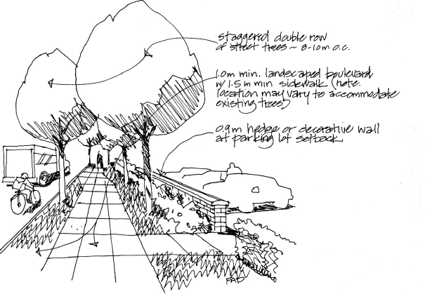 (a) A landscaped boulevard and sidewalk with a double row of street trees is considered suitable for this major thoroughfare.