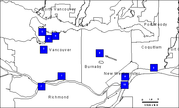 10. Royal City Star - New Westminster - with slotsThe following map illustrates the location of the ten casinos in the Greater Vancouver area: