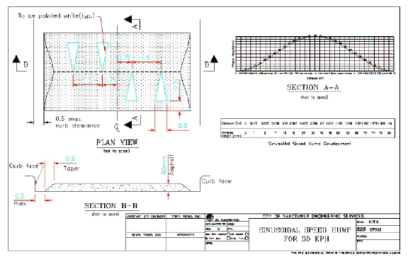 There are two designs used for speed humps on local streets (see Appendix B), one for 30 km/h speed zones and another for 40 km/h speed zones. The latter reflects the City's intention to lower the speed limit on local, residential streets from 50 km/h to 40 km/h. The main difference between the humps is their length, as the 40 km/h hump is designed to be more gradual. The two hump types are also designed to be installed at different intervals along the street, with more frequent humps on lower speed streets.