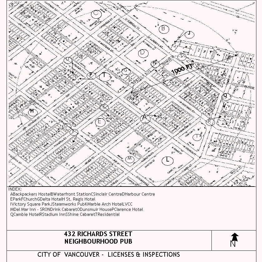 The Police Department acknowledges that the proposed Neighbourhood Pub is located within the vicinity of other licensed establishments, such as The Drink Nightclub, Malones Bar & Grill, The Piccadilly Pub, Steamworks, The Cambie Hotel and The Lion's Pub. The VPD does not support this application until the operators have demonstrated their ability to comply with all bylaws and regulations pertaining to their business and other establishments in their control.