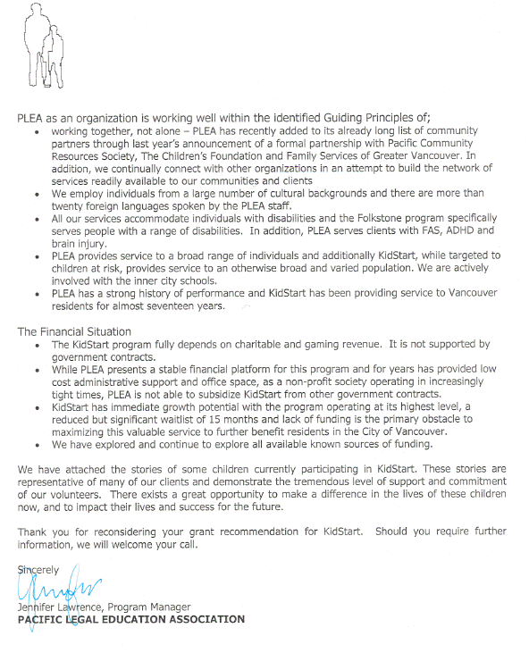 In their letter seeking reconsideration (attached), PLEA indicates that KidStart Mentoring Program participants (the children) are, for the most part, Vancouver residents who are experiencing disadvantages and/or facing discrimination and therefore are the City's identified top priority for service. It is also noted that the KidStart Program is not supported by government programs, relying on charitable donations and gaming allocations. However, PLEA is not in a financial position that enables them to continue to subsidize the program, particularly in light of ever increasing demand.