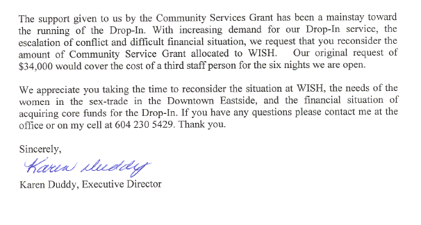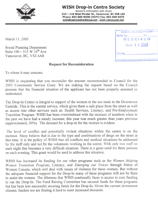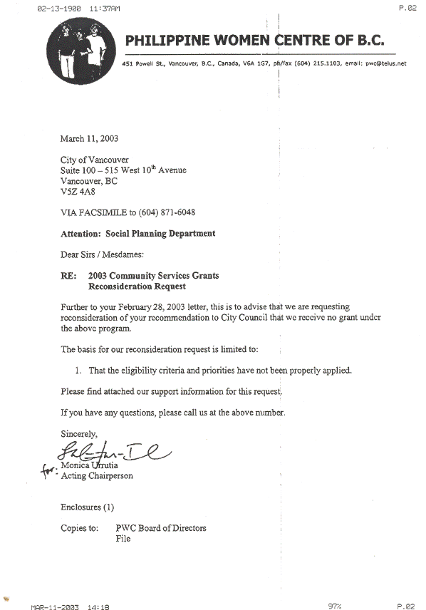 The Philippine Women Centre of British Columbia has requested reconsideration on the grounds that "the eligibility criteria and priorities were not properly applied". They put forth the argument in the attached letter that the needs of their clients and the work that they do to meet these needs are a very high priority.