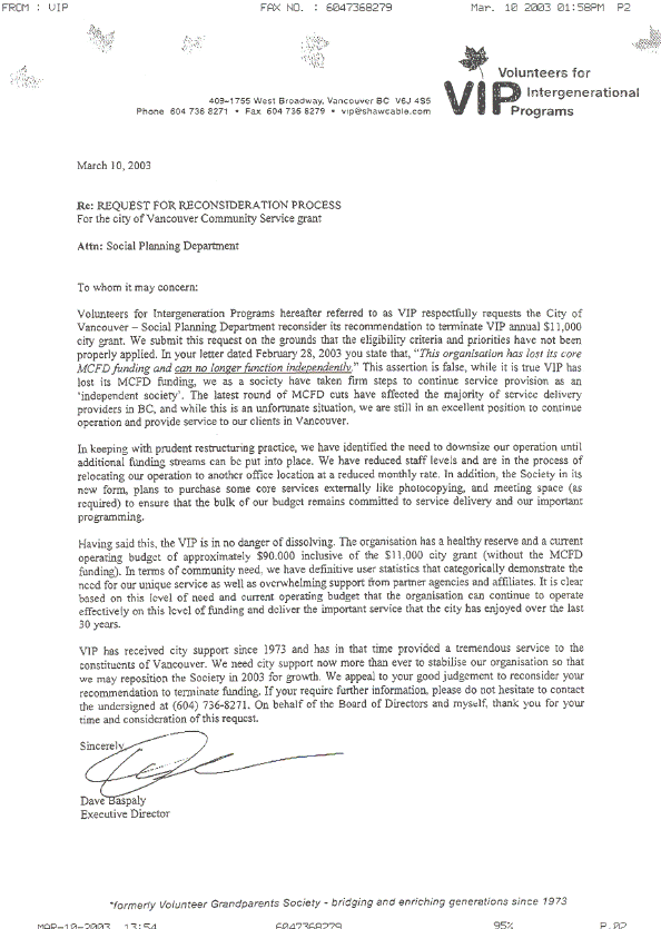 Social Planning staff recommended NO GRANT, with the explanation that this organization had lost its core MCFD funding and could not function independently any longer, and furthermore, it appeared that VIP had sufficient assets to cover the remainder of 2003, during which time it was going to seek a partner to deliver VIP programs.