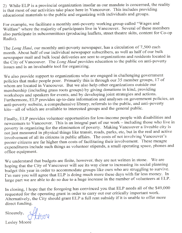 Staff recommended a Community Services grant and a rent subsidy for ELP equal to what was provided in 2002. This recommended grant allocation would have provided wages and benefits for one part time salary and some program expenses for work conducted in Vancouver. The rent subsidy grant would have covered just under half of the rental charges in a city-owned building.