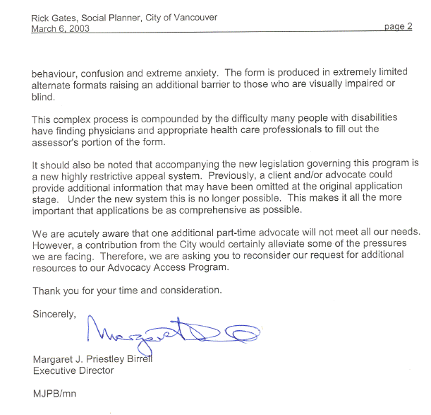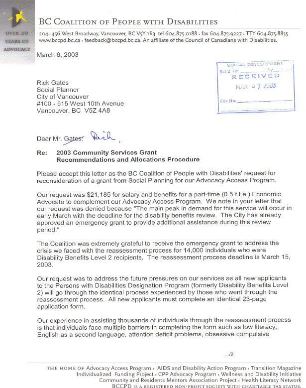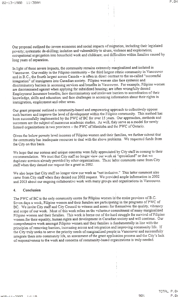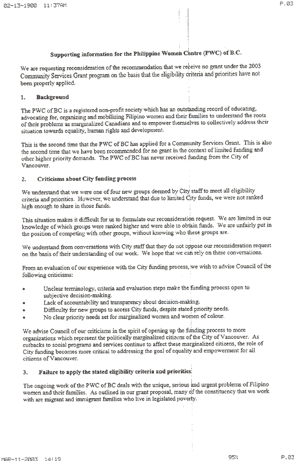 The Philippine Women Centre of British Columbia has requested reconsideration on the grounds that "the eligibility criteria and priorities were not properly applied". They put forth the argument in the attached letter that the needs of their clients and the work that they do to meet these needs are a very high priority.