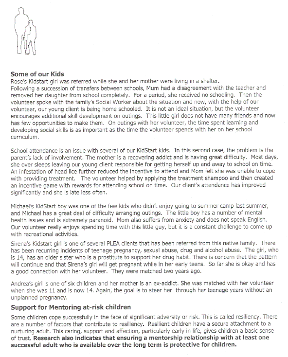 The grant request is to help fund the volunteer coordinator staff position for the KidStart Mentoring Program. The KidStart Mentoring Program, which has been in operation for many years, takes referrals for children (boys and girls) between the ages of six and 12 and matches them with a positive adult mentor of the same gender as the child. Referrals are usually brought forward by parents, teachers, social workers, police, mental health workers and community organizations.