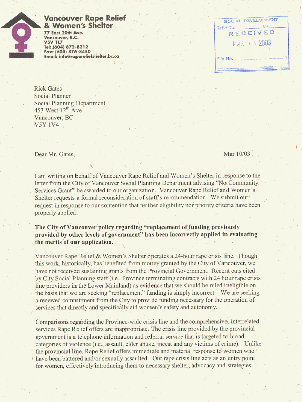 "Rape Relief has requested funding for 2.5 staff positions for its self-funded 24 hour rape crisis line. Staff note that the Province has recently terminated its contracts with other 24 hour rape crisis line providers in the Lower Mainland, and re-contracted with a new provider who is to run a Province-wide service. Until the situation with this new line and existing Vancouver rape crisis services is clearer, staff recommend against taking on any new organizations or programs. City policy with respect to any service area being funded by other levels of government is that grants cannot be provided for "replacement of funding previously provided by other levels of government."