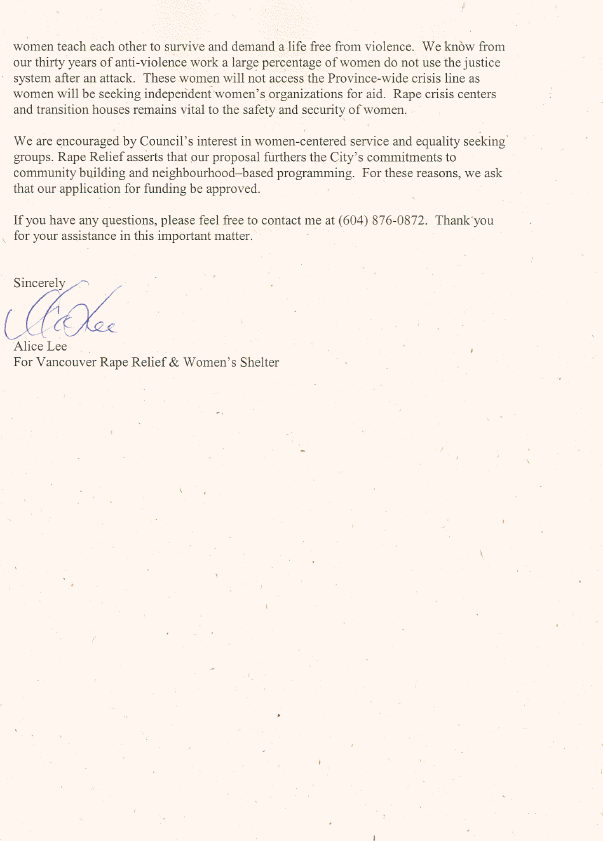 With regards to their request for a renewed funding commitment from the City, there is no record of such a commitment in the past. Council did approve a small $2,000 grant to Rape Relief in 1993, but nothing prior or since.