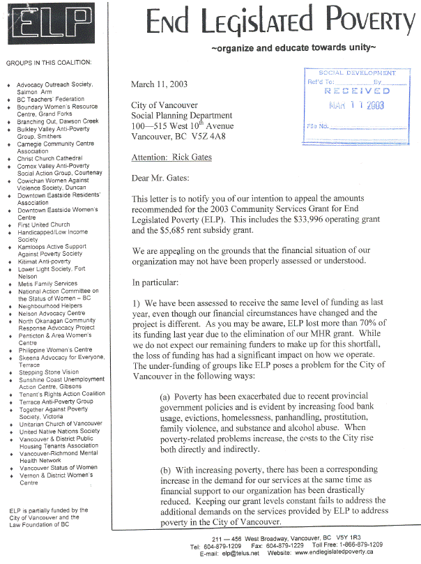 In the attached letter requesting reconsideration, ELP notes that it has lost 70% of its funding due to the elimination of a provincial grant. The organization has been clear in its correspondence that it does not expect other funders to make up the shortfall, however, ELP's Board and staff see this as a critical year in its survival. The Society has developed a restructuring plan to reduce its operating budget by half, from $304,378 in 2002 to $165,600 in 2003. Staff positions have been reduced from 5.75 FTEs to 3 part timepositions (a volunteer coordinator, front-line advocacy worker and a bookkeeper). The provincial work of the organization will be now be conducted by volunteers. The Vancouver-based work will be resourced by the volunteer coordinator who will recruit and support volunteers to do anti-poverty work specific to Vancouver.