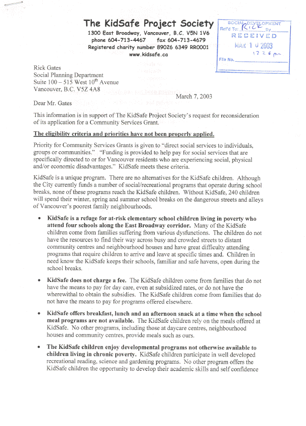 Staff recommended NO GRANT with the comment that "The City currently funds a number of year-round social/recreational programs for children that operate after school and during school breaks, as well as supporting licensed out-of-school care programs. The Kidsafe request is for positions to staff a 10 week program delivered during school breaks. In the context of available city funding and other priorities, staff do not recommend a grant."