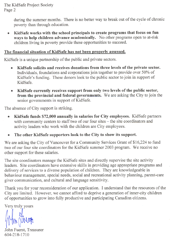 It is clear that the City, through Park Board staffing and facilities, is already contributing significant support towards the program. Likewise, the City's Community Services Grant program funds the salaries of two Boys and Girls Club's senior Program Co-ordinators in the Mount Pleasant area. Both staff provide oversight and supervision to all programs operating under Boys and Girls Club in the Mount Pleasant area, including Kidsafe.