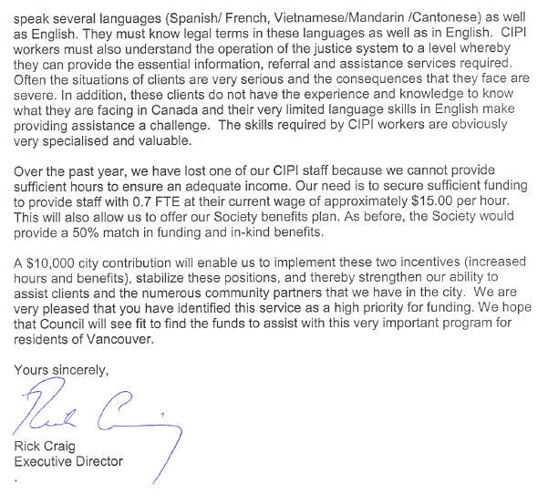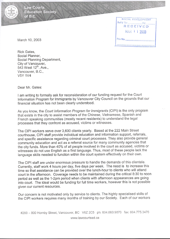 The grant request is to help fund an increase in hours for 2 part time community workers, one Chinese and Vietnamese speaking and the other Spanish and French speaking. These staff provide information, education, referral and support to immigrants and refugees from these communities who are appearing at the Vancouver Provincial Court as accused, victims, witnesses, or parties involving a civic suit. Provincial funding for translation services is only available for court proceedings and court translators are prohibited from providing advice or assistance.