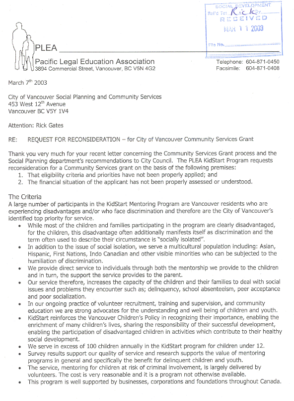 In their letter seeking reconsideration (attached), PLEA indicates that KidStart Mentoring Program participants (the children) are, for the most part, Vancouver residents who are experiencing disadvantages and/or facing discrimination and therefore are the City's identified top priority for service. It is also noted that the KidStart Program is not supported by government programs, relying on charitable donations and gaming allocations. However, PLEA is not in a financial position that enables them to continue to subsidize the program, particularly in light of ever increasing demand.