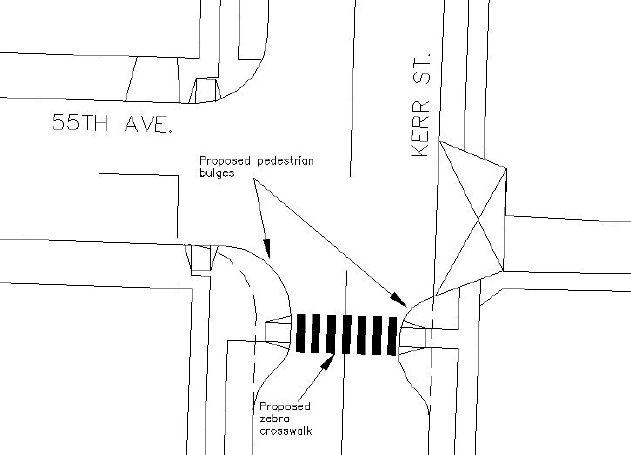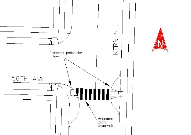 The intersections of Kerr at 55th and 56th Avenues are located at driveway entrances to Champlain Mall. Since redevelopment of this site, there has been an increase in pedestrian and vehicle traffic at these two locations. The Victoria-Fraserview & Killarney Community Visions group has also identified these intersections as priorities for pedestrian crossing enhancements. The majority of pedestrians crossing along this portion of Kerr street are seniors, as there is a senior citizens housing complex located at the north-west corner of Kerr & 55th. It is recommended that curb bulges and marked crosswalks, as shown in Appendix A, be installed at these intersections.