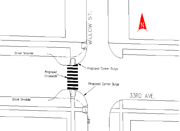 The intersection of 33rd Avenue at Willow is located at the north-east corner of Eric Hamber Secondary School and is highly used by parents of students as a pick-up and drop-off point. Staff observed high volumes of students crossing 33rd to continue northbound on Willow or to be picked-up. Field studies also showed that Willow Street, along the entrance of the school, becomes congested with parents waiting to pick up students. This line-up extends from the school entrance to 33rd Avenue, which results in a queue of westbound vehicles on 33rd waiting to turn onto Willow Street. This school traffic, in addition to the regular commuter traffic on 33rd, can result in motorists being less attentive to pedestrians at the intersection. Corner bulges and a marked crosswalk are recommended, as shown in Appendix A.