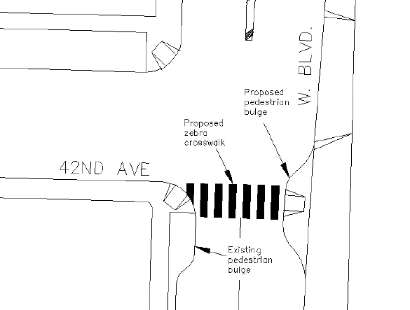 This intersection is located at the north-east corner of the Kerrisdale Community Centre. During field studies, staff observed high volumes of pedestrians especially seniors crossing at this location, as the entrance to the community centre is located off 42nd Avenue. Currently, there is a marked crosswalk along with a bulge on the south-west corner of the intersection. Staff propose that an additional bulge be installed at the south-east corner to further reduce pedestrian crossing distances and prohibit northbound motorists from passing on the right.