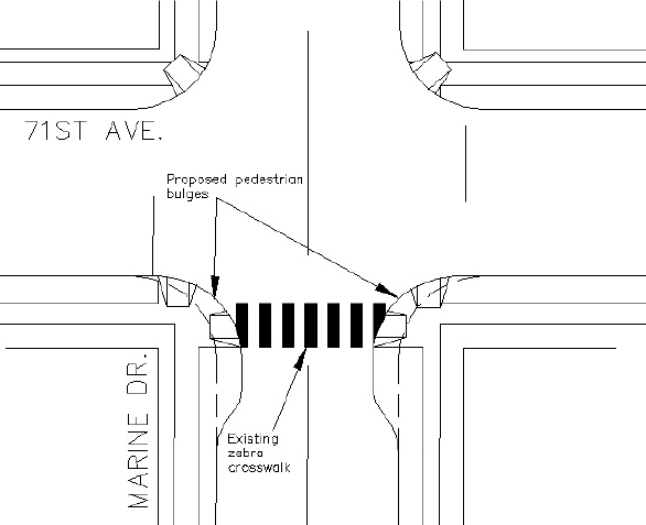 The intersection of SW Marine and 71st Avenue is located at the north-east corner of William Mackie Park. During field studies, staff observed children crossing at this location to access the park and playground. Last year, zebra pavement markings were installed at the existing marked crosswalk which has helped to increase motorists awareness of the crossing. However, there are still concerns regarding motorists speeds and passing on the right. Therefore, corner bulges, as shown in Appendix A, are recommended to accompany the marked crosswalk to help address these concerns.