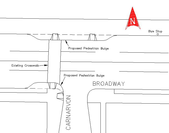 The intersection of Broadway at Carnarvon is located in a busy retail area with heavy pedestrian and traffic volumes. Although there is a signalized intersection a short block to the east at Bayswater, there is still a high demand for pedestrians to cross at Carnarvon. Carnarvon intersects Broadway at a "T" and a marked crosswalk has been installed on the west leg to emphasize the pedestrian crossing. However, field studies showed that motorists would park at the top of the "T" and within the corner clearances, limiting pedestrians' visibility of approaching vehicles. In order to prohibit motorists from parking in the clearance zones and increase visibility of the crosswalk, staff recommend that pedestrian bulges be installed to accompany the existing marked crosswalk, as shown in Appendix A.