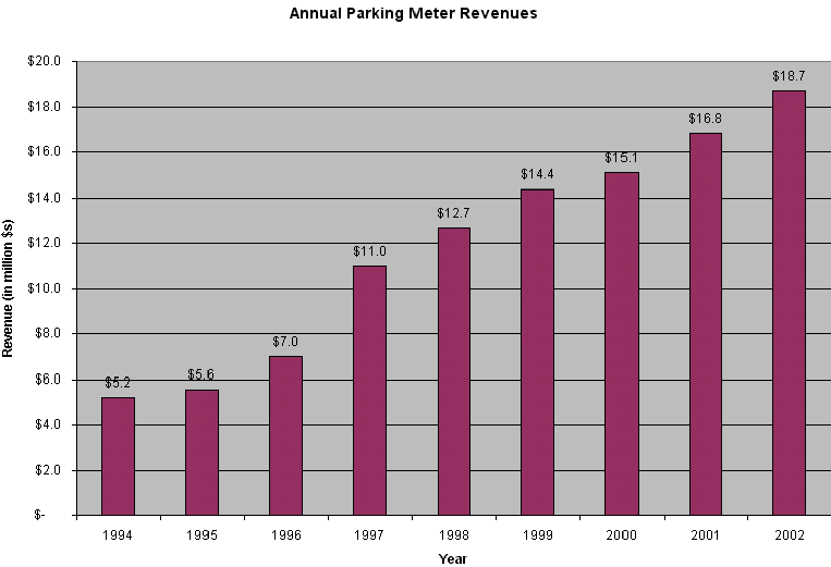 Over the past several years, meter rates were adjusted in areas outside the Downtown core. The recent review indicates that rates should be adjusted in the Downtown core as shown in Appendix A. The meter rates for these proposed areas have not been adjusted for the last several years. Proposed hourly rate increases are: from $1.50 to $2.00 for approximately 207 meter spaces and from $3.00 to $4.00 for approximately 492 meter spaces. The anticipated increase in revenue would be approximately $860,000 for the remainder of 2003, and approximately $1.1 million in subsequent years, a 6% increase.