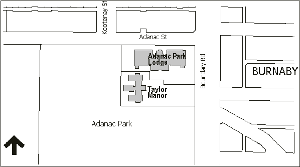 Taylor Manor is located at the corner of Adanac and Boundary Rd., and is surrounded by Adanac Park to the south and west. It shares the site with Adanac Park Lodge multi-level care facility operated by Little Mountain. The location is noted on Figure 1. The building comprises approximately 21,410 sq. ft. on three floors, and is located on a 1.32 acre park-like site. It is owned by the City, and held as a capital asset.
