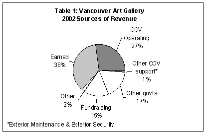 The Vancouver Art Gallery's relationship with the City is generally outlined in an operating agreement from 1992 which has not been signed and a new lease/operating agreement is currently under negotiation. In addition to an annual operating grant, the City currently provides occupancy of the facility at a nominal rent, property tax exemption, exterior maintenance and exterior security. The organization's sources of revenue and City support (28% of revenues from all sources) is illustrated in Table 1.