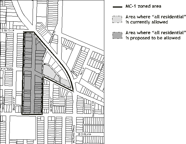 In addition, the City has since zoned two more areas MC-1 (East Hastings Street and Hudson Street) and has allowed all-residential to be located on similar frontages that are not on noisy arterials.