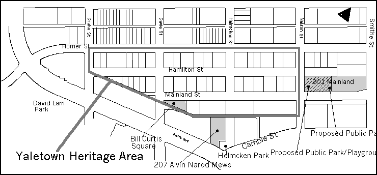 In January 2000, when the parking in 207 Alvin Narod mews was approved, it was noted that "there may still be a future need for parking spaces to serve the Yaletown heritage area. City staff continue to seek a site along the west edge of the Yaletown heritage area to meet this need."