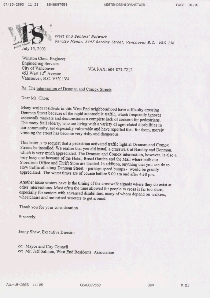 Recent studies have shown that there are high volumes of seniors crossing at Denman and Comox, and that motorists' are inattentive to pedestrians in the crosswalk. During the AM and PM peak periods, there are few adequate gaps for pedestrians to cross and some motorists stop on the crosswalk area forcing pedestrians to walk between cars. Staff have also received strong support from a number of community groups in the West End. Furthermore, both Denman and Comox Streets are being considered for future greenways and the installation of a pedestrian signal would not preclude future design options to assist cyclists and pedestrians along this route.