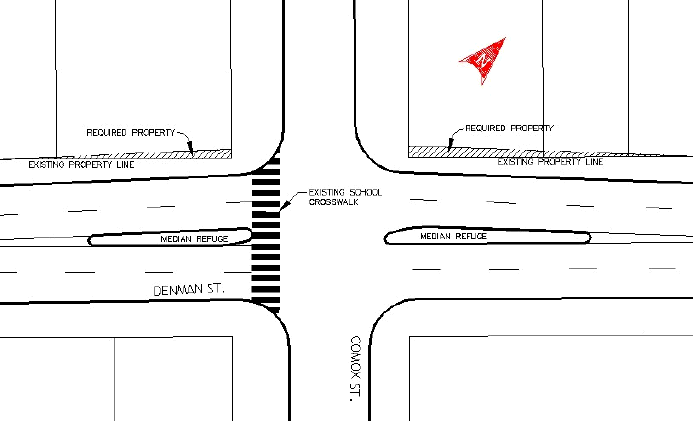 Figure 2 is an illustration of a centre median at the intersection of Denman and Comox. In order to address the issue of trapped vehicles, as noted in the previous section, the existing 4 lane cross-section on Denman was maintained in this design. The installation of a centre median would still accommodate full-time parking and bike lanes on Denman if recommended in the future. However, the existing street width on Denman would not be wide enough to maintain the existing sidewalk widths, a 4 lane cross-section, and the centre median. Therefore, the City would need to acquire a portion of adjacent properties, as shown in the hatched area in Figure 2. Considering these properties would have to be redeveloped in order to acquire this property, the centre median would not be feasible in the near future. As a result, this option is also not recommended, at this time.