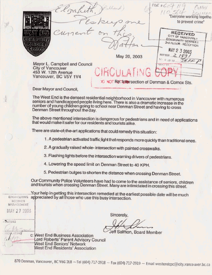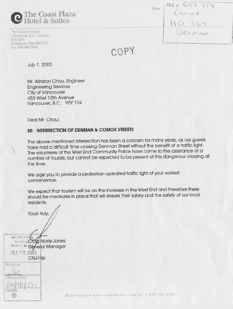 · Coast Plaza Hotel.All of these groups expressed strong support for a pedestrian signal at Denman and Comox. Furthermore, as both Denman and Comox Streets will be considered as future greenways, staff consulted with the Bicycle Advisory Committee and the Greenways Branch who also indicated strong support of the proposed pedestrian signal. Attached in Appendix A, are the correspondence from several of these groups.