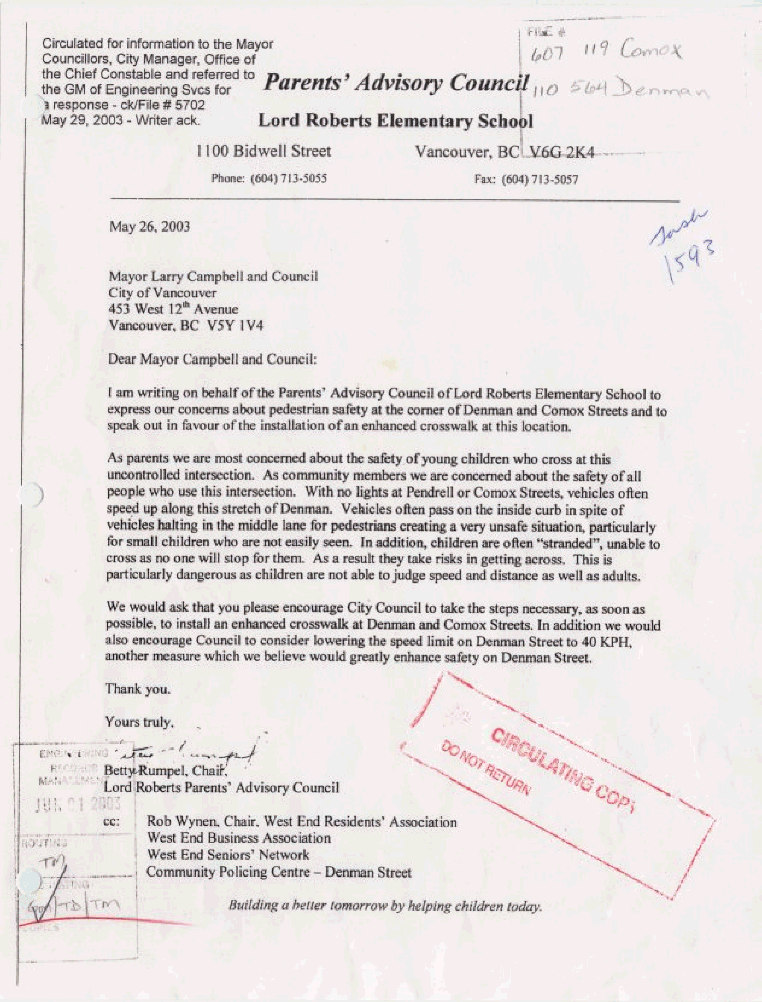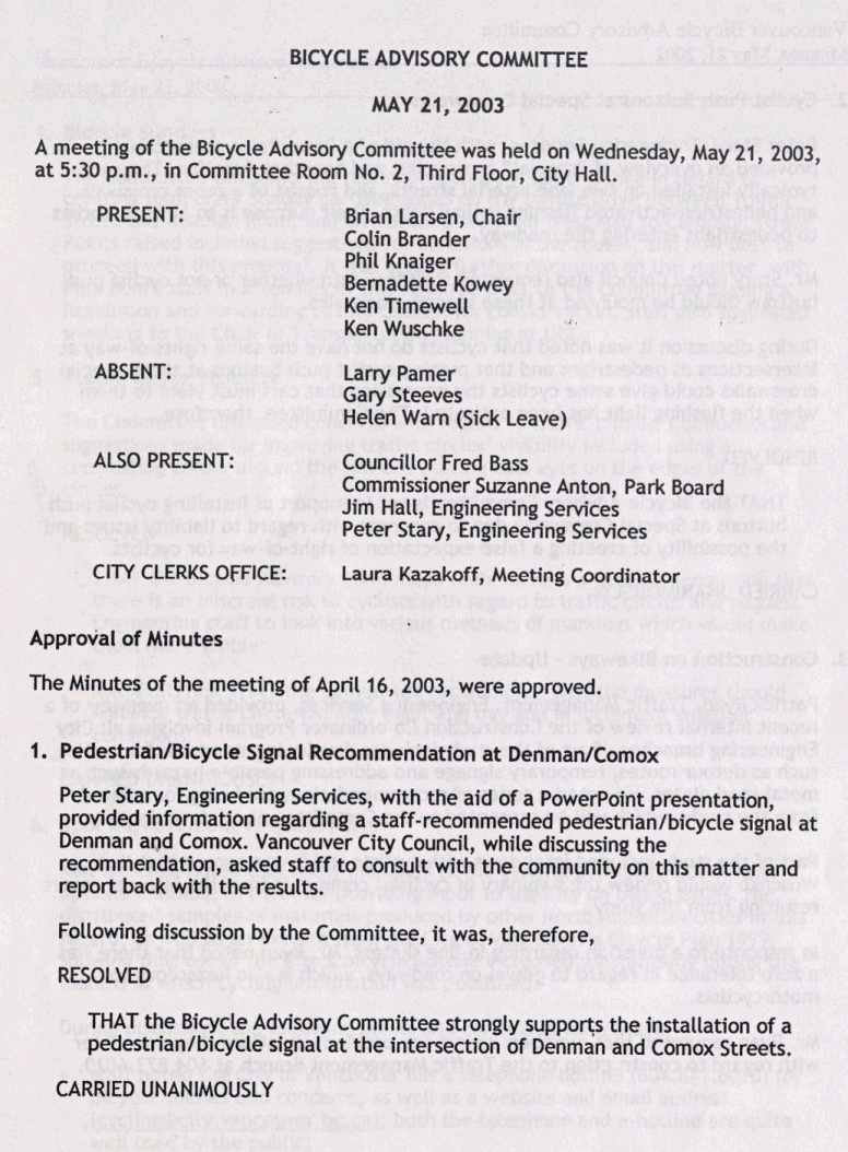 THAT a pedestrian-controlled signal be approved for the intersection of Denman & Comox with funding of $40,000 provided in the 2003 Streets Basic Capital Budget, submissions A-3a: New Pedestrian and Vehicle Signals.
