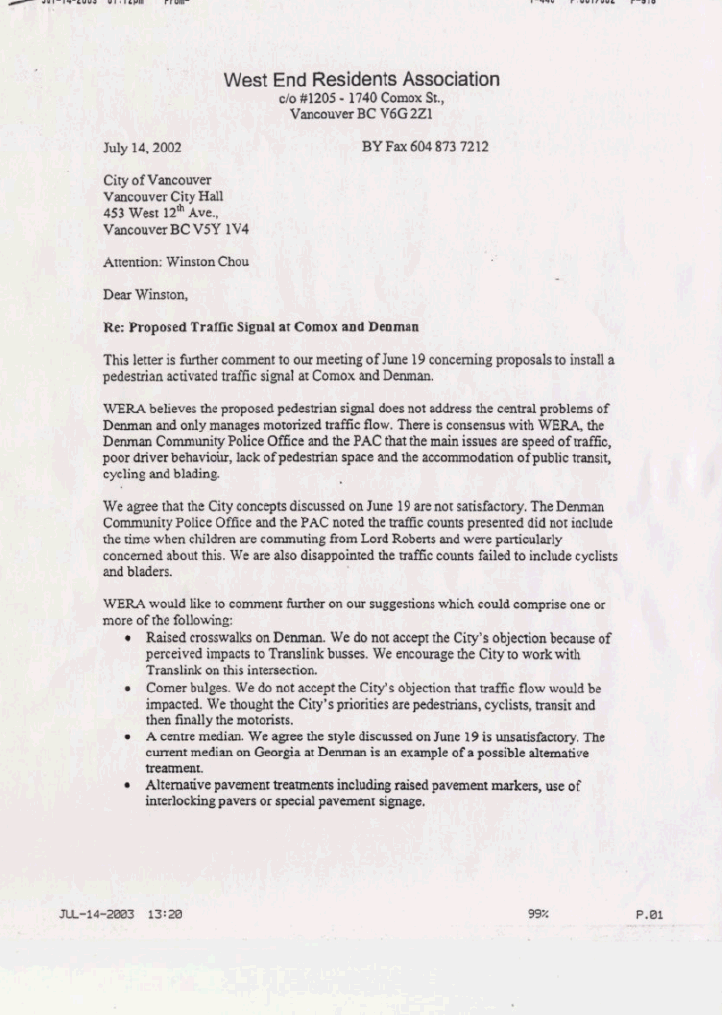 As part of the 2003 Traffic Signal Program, staff recommended a pedestrian signal at the intersection of Denman and Comox. During the presentation of the Traffic Signal Program at the May 13th, 2003, Transportation and Traffic meeting, a delegation from the West End Residents' Association (WERA) addressed Council with concerns that WERA was not consulted on the proposal and requested that traffic calming options be examined to enhance pedestrian conditions at Denman and Comox.
