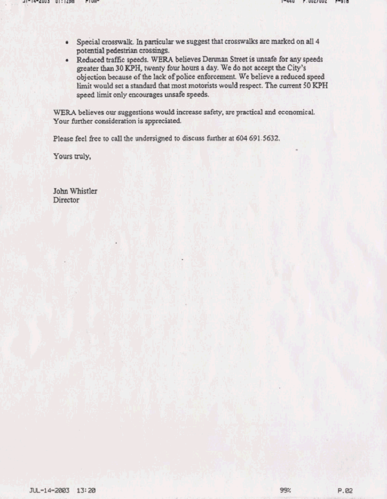 On June 19, 2003, staff attended a meeting to consult with members of the West End Residents Association, the Parent Advisory Council for Lord Roberts Elementary School, and the West End Community Policing Office. At that time, members of WERA expressed their concerns for the proposed pedestrian signal and requested that staff continue to review traffic calming options for the intersection. Attached in Appendix B, is the correspondence from WERA following the meeting on June 19.