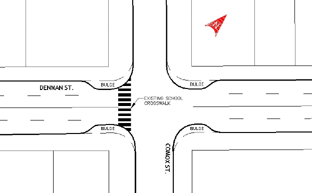 A special crosswalk was considered as an alternative to enhance crossing conditions at Denman and Comox. However, based on detailed reviews of pedestrian profile and volumes, driver courtesy, and gaps in traffic, it was determined that a pedestrian-controlled signal would be a more suitable device to assist pedestrians at this location.