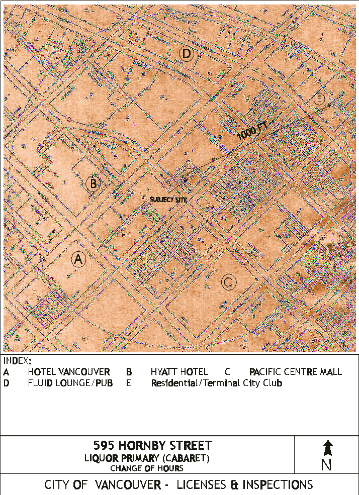 The applicant has been operating Brandi's Show Lounge, located on Hornby Street at Dunsmuir Street, since 1999. The surrounding area is a mixture of office, retail and restaurant uses (Appendix A). The establishment has 199 licensed seats; within a 1000 foot radius of the subject site, there are an additional 2131 Liquor Primary seats distributed among three club lounges and ten hotel lounges and 25 liquor licensed Restaurants.