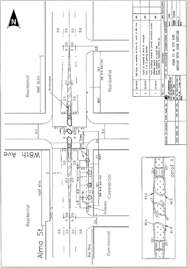 In 1999, in response to concerns raised by residents and cyclists about difficulties in crossing Alma at 8th Avenue, the intersection was reviewed again. Knowing the concerns about the loss of parking in the area, the proposed median was redesigned to minimize the impacts. The median was reduced in length and designed with a shorter taper (20:1) that would give vehicles along Alma a shorter length to manoeuvre around the median. In addition a field review of the parking conditions in the area was completed. It showed that although parking spaces would be more difficult to find during peak periods, the parking availability was adequate. A survey of residents about the redesigned median showed that 60% of local and 61% of area-wide residents supported it. As a result, Council approved the redesigned median and the median was constructed in late 2000.