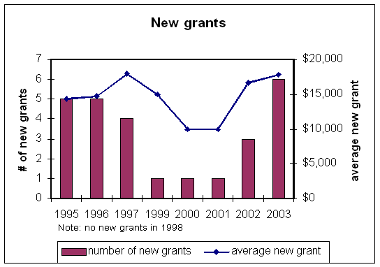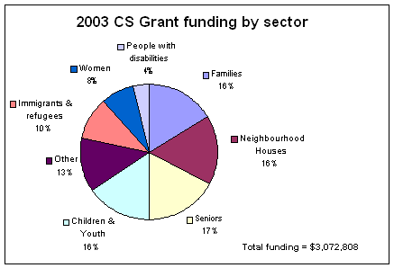 In 2003, City Council approved 95 CS Grants, totalling $3,072,808 to 81 non-profit organizations. Council also approved four rent subsidy grants, totalling $67,007 and set aside $20,000 from the CS Grants budget for the Partners in Organizational Development grants, which will be dealt with before the end of this year.