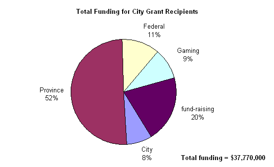 The City contributes 7.75 % to the total operating budgets of Community Services Grants recipients. The Province contributes the most at 51% of the total. Note also the very large contribution from fund-raising, more than double the City grants amount.