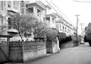 (c) When the first level at the rear is set back substantially (usually, but not exclusively, because it contains residential) there should be a minimum 1.5 m wide strip of planting located at the lane edge. Private fencing, if present, should be located on the inside of this planting area. Provision to protect the planting from lane traffic should be made through the use of a low planter and/or substantial curbs and bollards.