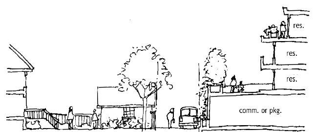 Parking and loading are essential service functions. However, they can detract from residential livability unless skilful design is used to screen them from residential uses in and near the development.