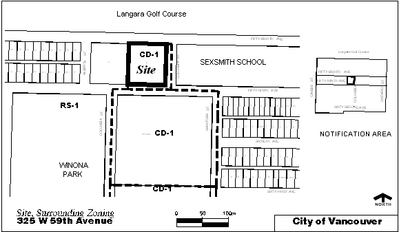 The remainder of the surrounding lands are zoned RS-1. To the west is the one-storey Amherst Hospital and Nursing Home, with one-family dwellings to the west of that. To the southwest is Winona Park comprised of playing fields. To the north, across the public pathway, is the Langara Golf Course service yard. To the east, across Columbia Street (which is paved but closed off to all but service yard traffic), is bushland followed by the Sexmith Elementary school playground. To the southeast are one-family dwellings.